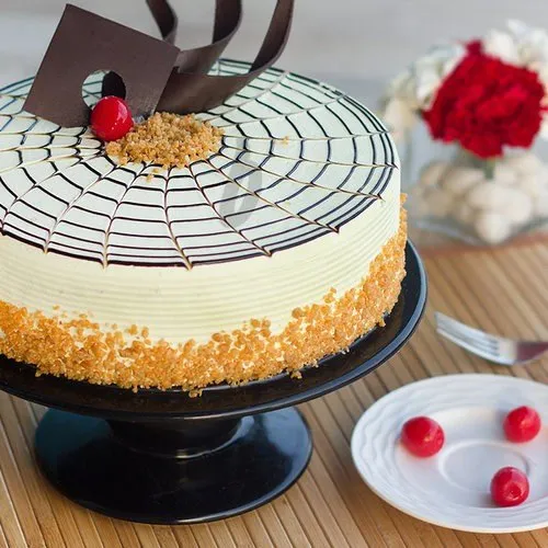 Made with soft, fluffy sponge layers, this cake is filled with smooth butterscotch cream and loaded with crunchy butterscotch chips that add a delightful texture in every bite. Topped with a glossy butterscotch glaze, cream swirls, and sprinkled with caramel crunch, this cake offers a perfect balance of softness and crunch. Its rich taste and beautiful presentation make it an ideal centerpiece for any celebration.